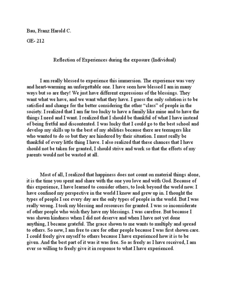 Sample reflection paper (submitted by a student in crim 1006e, fall term 2003). Read some examples of reflection papers to give you an idea of how to gather your own thoughts. A reflective note encourages you to think about your personal reaction to a legal issue raised in a course. Reflective essay topics · a memorable encounter · the toughest decision you had to make · the most frightening moment of your life · visiting a zoo · your favorite . An essay diary can take the form of .